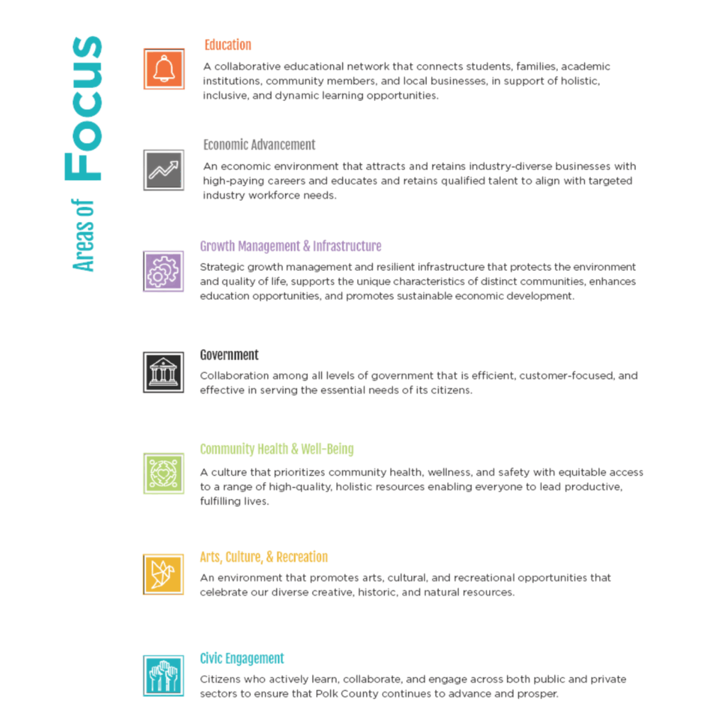 The Community Vision for improved Quality of Life is defined within seven Areas of Focus.
